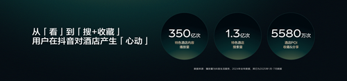 数据显示,过去一年,抖音上 “特色生活方式酒店” 相关内容播放量超过350亿次。今年1月至7月,抖音用户对“特色酒店”进行了1.3亿次搜索,酒店POI收藏与分享达5580万次。这意味着,越来越多用户习惯在抖音“找酒店、看酒店、选酒店”,抖音已成为生活方式酒店释放增长潜力的新场域。