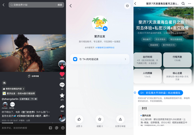 抖音旅行负责人吕家淇表示:“斐济旅行内容在抖音平台一直保持着较高的用户关注与互动热度。此次与斐济旅游局的合作,是抖音旅行在目的地场景中推动AI能力落地的重要实践。我们期待通过AI旅行规划师,进一步打通内容与服务之间的链路,为用户提供更高效、直观的出行决策支持。”