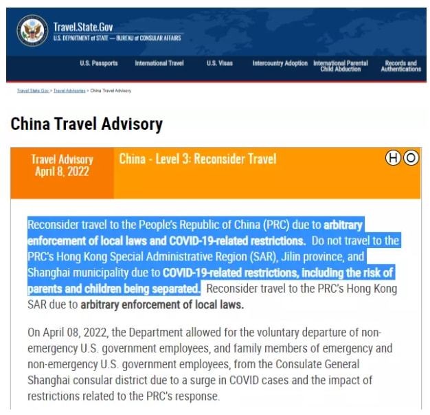 与此同时,美国国务院官方还发布了中国旅行警告,要求美国公民谨慎考虑前往中国香港、吉林、上海等地旅行。