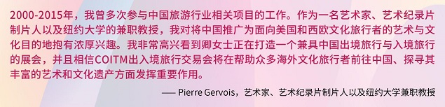 而身处美国的法国艺术家、艺术纪录片制片人以及纽约大学兼职教授Pierre Gervois对2026COITM出入境旅行交易会的筹备非常兴奋地表示“他积极支持COITM,并认为COITM将帮助众多海外文化旅行者前往中国、探寻丰富的艺术和文化遗产方面发挥重要作用。”