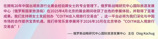 此外,俄罗斯战略研究中心国际旅游发展中心(俄罗斯国家旅游局)、突尼斯旅游局、白俄罗斯旅游局等也对2026 COITM的举办表达了强烈支持和参与愿望,彰显出国际社会对中国旅游市场的高度信心!
