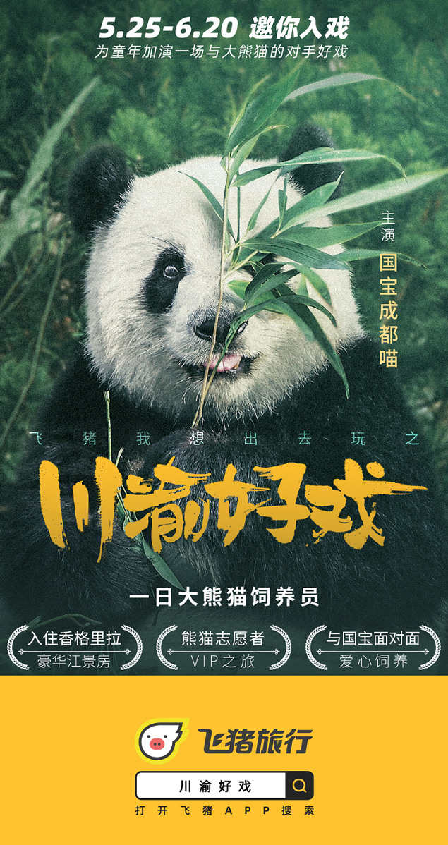 为助力川渝两地共建具有国际影响力、竞争力的巴蜀文旅产业带,打造世界文化旅游目的地,飞猪“我想出去玩”特别推出川渝主题月。在飞猪主题页面上,有遛娃手册、美食指南、川西风光、影视同款、夜游攻略、拍照打卡等多个主题游板块。飞猪还将在5月26日打造川渝专场直播日,将川渝的吃喝玩乐好货带给广大消费者。
