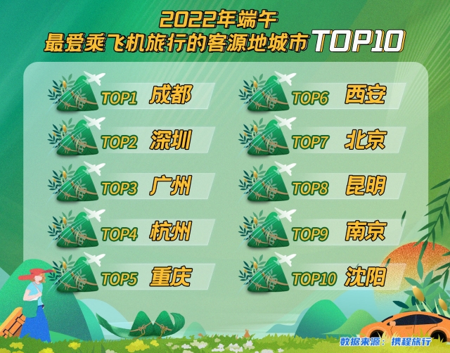 根据携程机票数据显示,端午假期中最繁忙的三个航段均与成都有关(“成都-深圳”;“深圳-成都”,“成都-广州”)。从机票预订的市场份额来看,成都在机票预订客源地和目的地两个维度均保持第一。当东南沿海的人们飞去成都享受巴适的美食,成都人也热衷前往广州、杭州等地品味水乡风情。