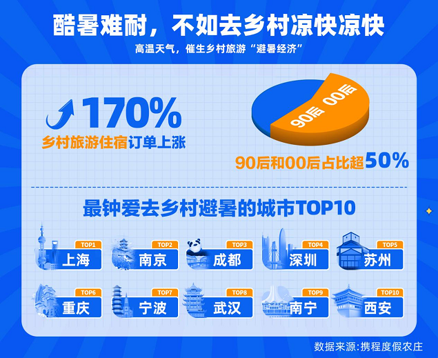 端午前后,随着北京、河南、陕西等多地分别发布了高温预警,因高温催生的避暑需求,让乡村旅游成为了这个夏天最早受益的目的地。根据携程平台数据,今年端午期间,全国乡村游酒店民宿订单量同比增长超170%,其中,90后和00后人数占比超过50%,其中上海、南京、成都、深圳、苏州、重庆、宁波、武汉、南宁、西安的游客最热衷于到乡村避暑。