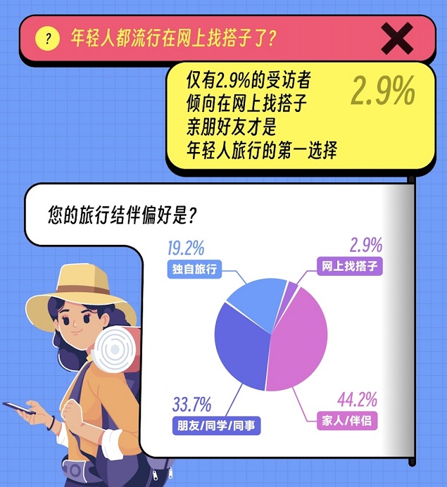 关于年轻人旅行结伴偏好的调查结果同样出人意料。仅有2.9%的受访者倾向在“网上找搭子”,知根知底的亲朋好友以77.9%的占比一骑绝尘。社交媒体上“风很大”的“网上找搭子”在现实中需要面对的种种问题是令年轻人望而却步的主要原因。马蜂窝攻略群用户表示,是否安全可靠、双方的消费习惯差异、兴趣差异等,是他们对“网上找搭子”的几大顾虑。