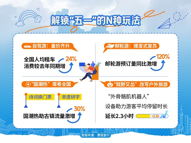 除此之外,“来沪扫货”“老外拖着行李箱去义乌采购”等话题引爆五一社交圈,免签政策、中国的离境退税政策等激发了外国游客的“中国购”旅游+购物模式。携程数据显示,五一假期上海、深圳、义乌等地入境游订单分别同比增长138%、188%和60%。