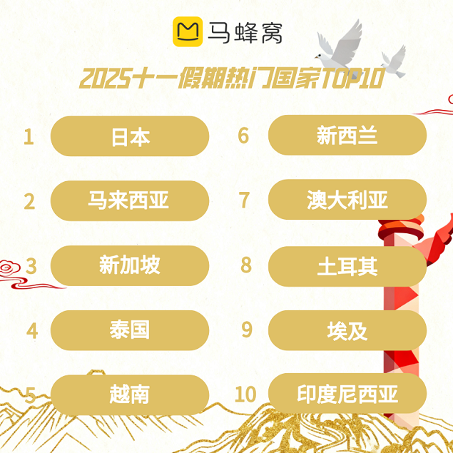 出境游同样在这个长假迎来高峰,日本、马来西亚、新加坡、泰国、越南、新西兰、澳大利亚、土耳其、埃及、印度尼西亚位列热门国家前十。马蜂窝此前推出的“AI旅行助手”APP,以及AI订餐厅、AI对话翻译成为畅游日本的实用帮手,十一期间使用量增长显著。