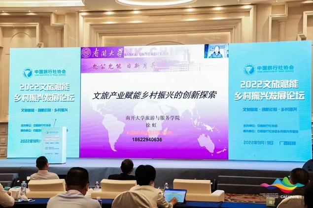 南开大学旅游与服务学院院长、南开大学休闲农业与乡村旅游研究中心徐虹主任、中国旅行社协会乡村振兴专业委员会会长单位北京山海文旅集团何时印副总裁,分别以“文旅赋能乡村振兴的创新探索”、“乡村振兴未来发展”为主题发表了主旨演讲,阐述了文旅赋能乡村振兴发展的新理念。疫情常态化的背景下,旅游业积极寻求生机,发现市场新需求,开拓发展新空间。桂林也在着力打造世界级旅游城市,入境旅游的重要地位不言而喻,桂林唐朝国际旅行社有限公司董事长兼总经理周晓光分享如何重塑乡村旅游新体验,乡村旅游国际化的发展趋势。桂林旅游学院副院长钟泓、景域驴妈妈集团助理总裁国庆华、北京慢村旅游开发有限公司副院长马俊分别从如何推动乡村职业教育,创新引领乡村人才振兴以及提升目的地规划建设、投资运营、营销推广等方面分享案例和经验建议。