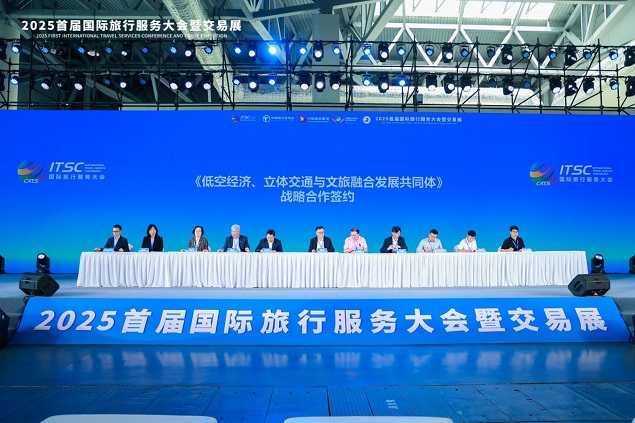 旅服会期间,多个创新领域取得实质性突破。中国旅行社协会铁道旅游分会、定制旅行分会与中国国土经济学会国土交通委员会达成三方合作,将共同开发“高铁+目的地”“专列+主题体验”等特色产品。《低空经济、立体交通与文旅融合发展共同体》战略合作协议的成功签署,将整合低空飞行运营、文旅项目开发等资源,打造低空观光、航空运动等多元场景,填补区域低空文旅业态空白。