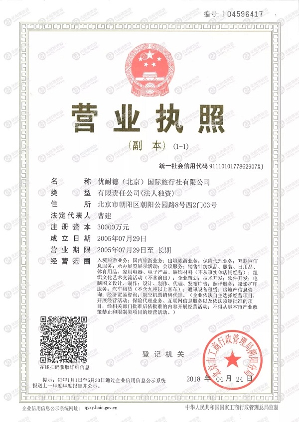 近日,优耐德(北京)国际旅行社有限公司在北京市工商行政管理局朝阳分局完成了注册资本变更的工商变更登记手续,并取得了北京市工商行政管理局朝阳分局颁发的变更后的《营业执照》。本次增资完成后,优耐德(北京)国际旅行社有限公司的注册资本将由人民币 150 万元增加至人民币 3 亿元。