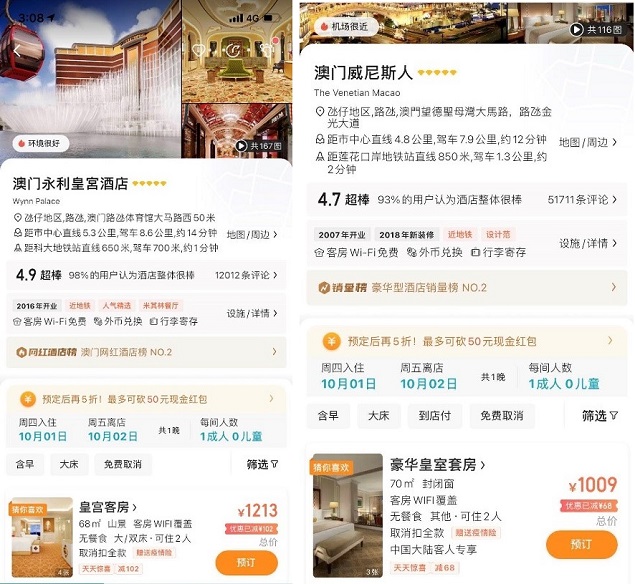例如:预订10月1日入住的澳门四季酒店最便宜价格为1128元/间夜;网红酒店永利皇宫10月1日入住最低总价在1213元起。像JW万豪、威尼斯人等澳门知名酒店最低价格只要千元左右。
